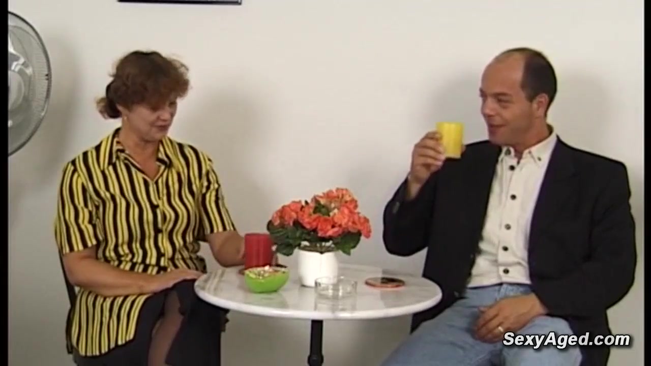 Busty amateur German mature lady Beatta jerking big dick to balding guy Gustavo Meunier while he toying her hairy pussy then he fucks her