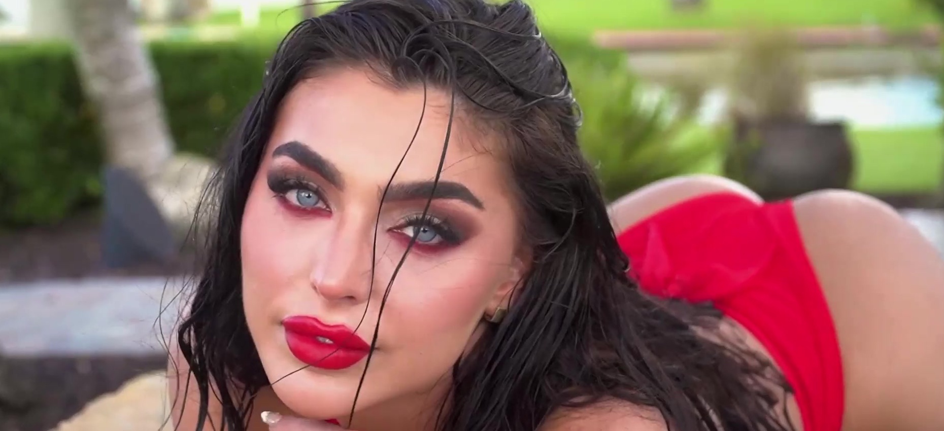 Description: Glamorous inked brunette babe Emjay Rinaudo with perfect tits is taking off her sexy red swimsuit by the pool outdoor The naked beauty is posing to show us her shaved pussy then she goes to the pool to cool down her hot body