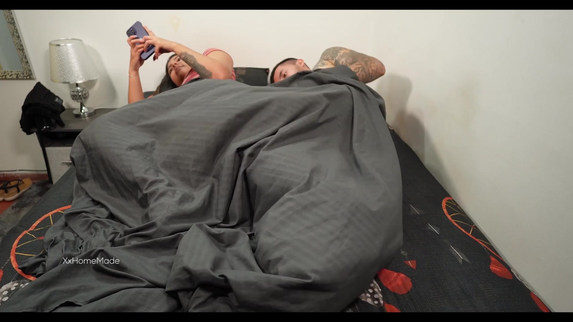 Step son's friend fuck his new step mom while phone talking in share bed