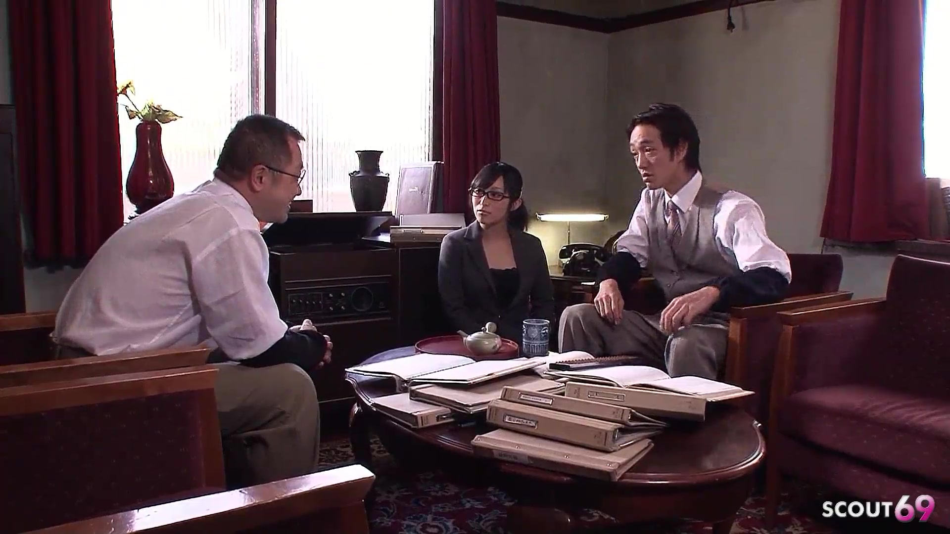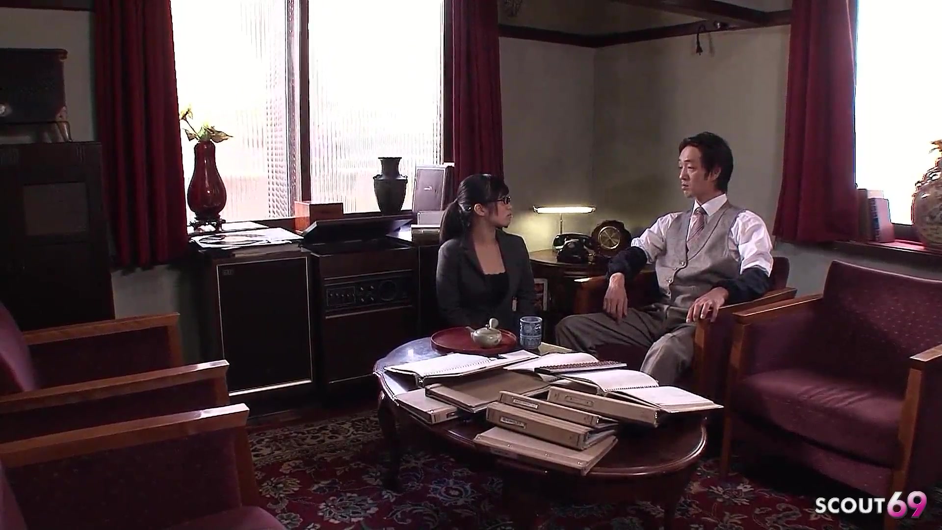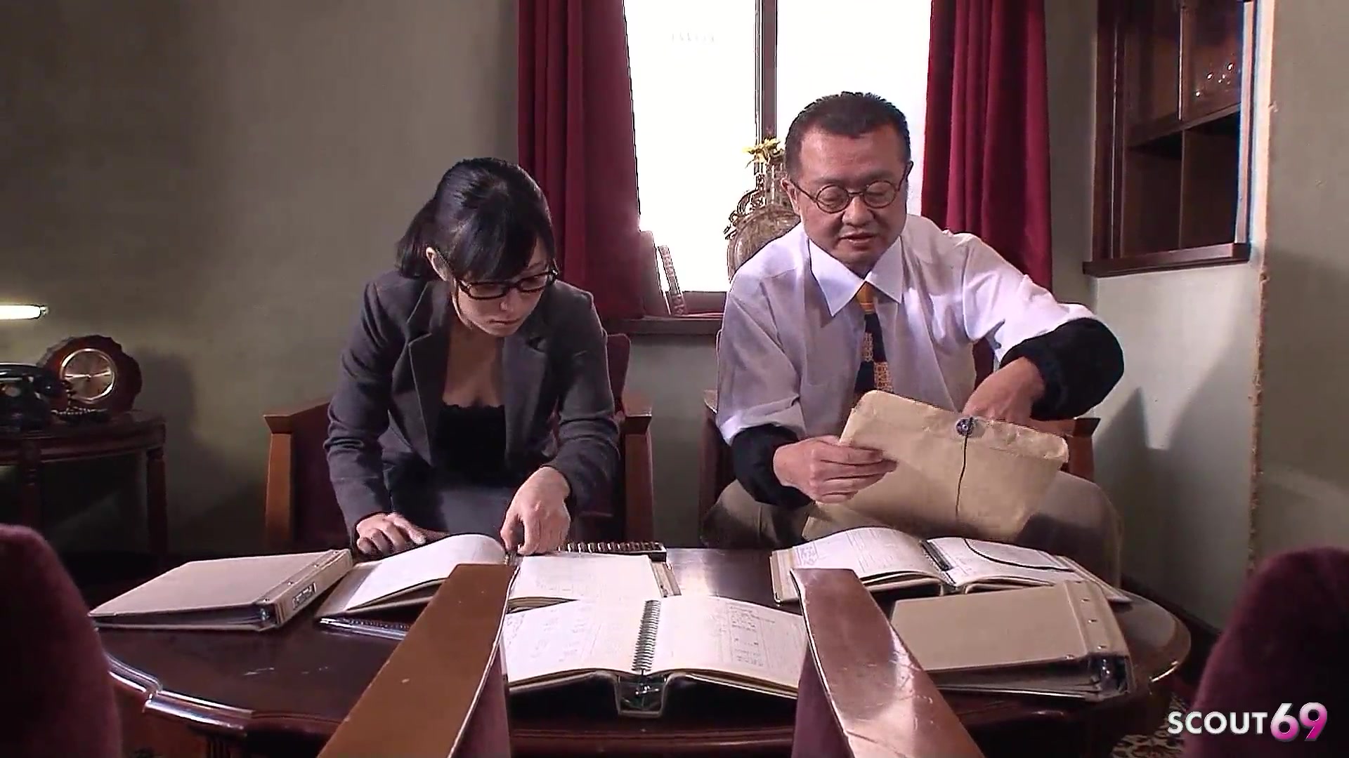 Japanese Teen secretary with Glasses seduce to Suck Fat Penis of old ugly Guy in uncensored JAV