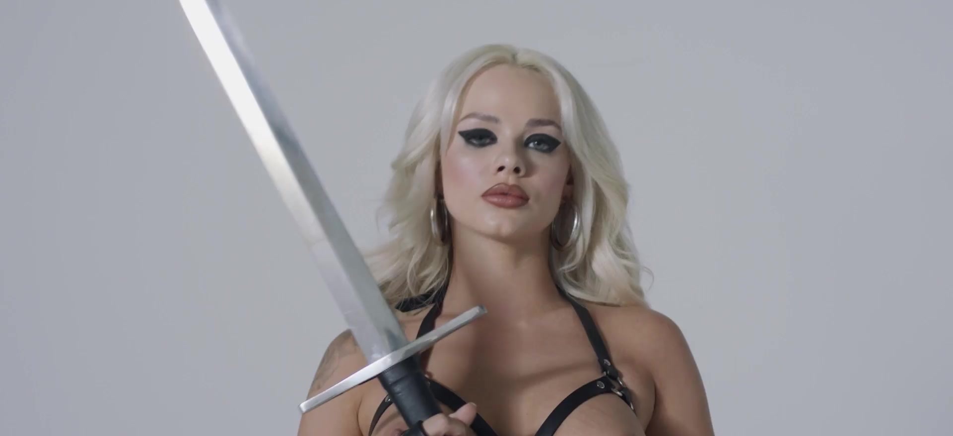 Petite blonde teen posing with the sharp sword and showed her curvy body