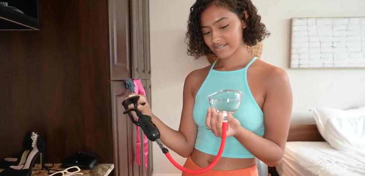 Description: Dani is looking for something in stepmoms room, when she find out a pussy pump.She uses it to her titties, but when Juan came in and caught her, he told her that its a pussy pump. She then put it on her pussy and started pumping it. Loco had a boner, and they decide to have sex right there and then