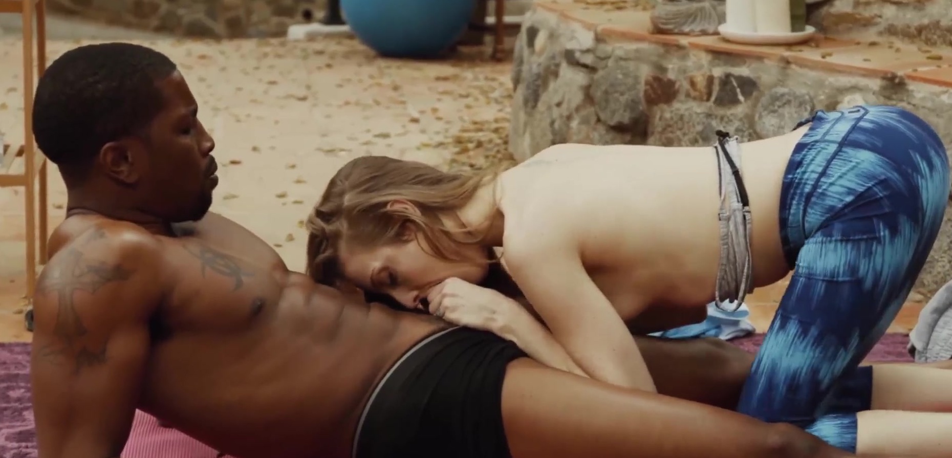 Description: Pretty girl enjoys yoga with a black man as they slowly get naked together and fuck on a floor.