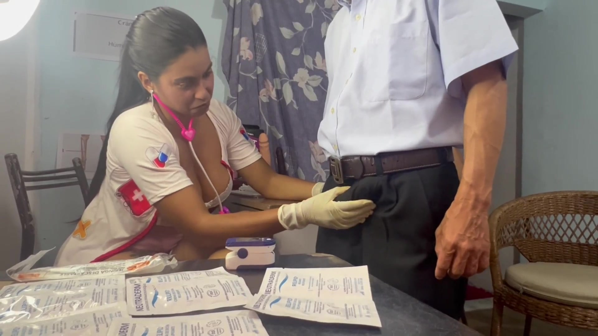 doctor threeway, she takes out the semen from her patient's stepbrother and masturbates her cute hot and slutty busty and big butt patient