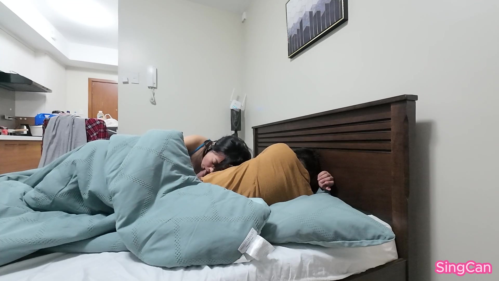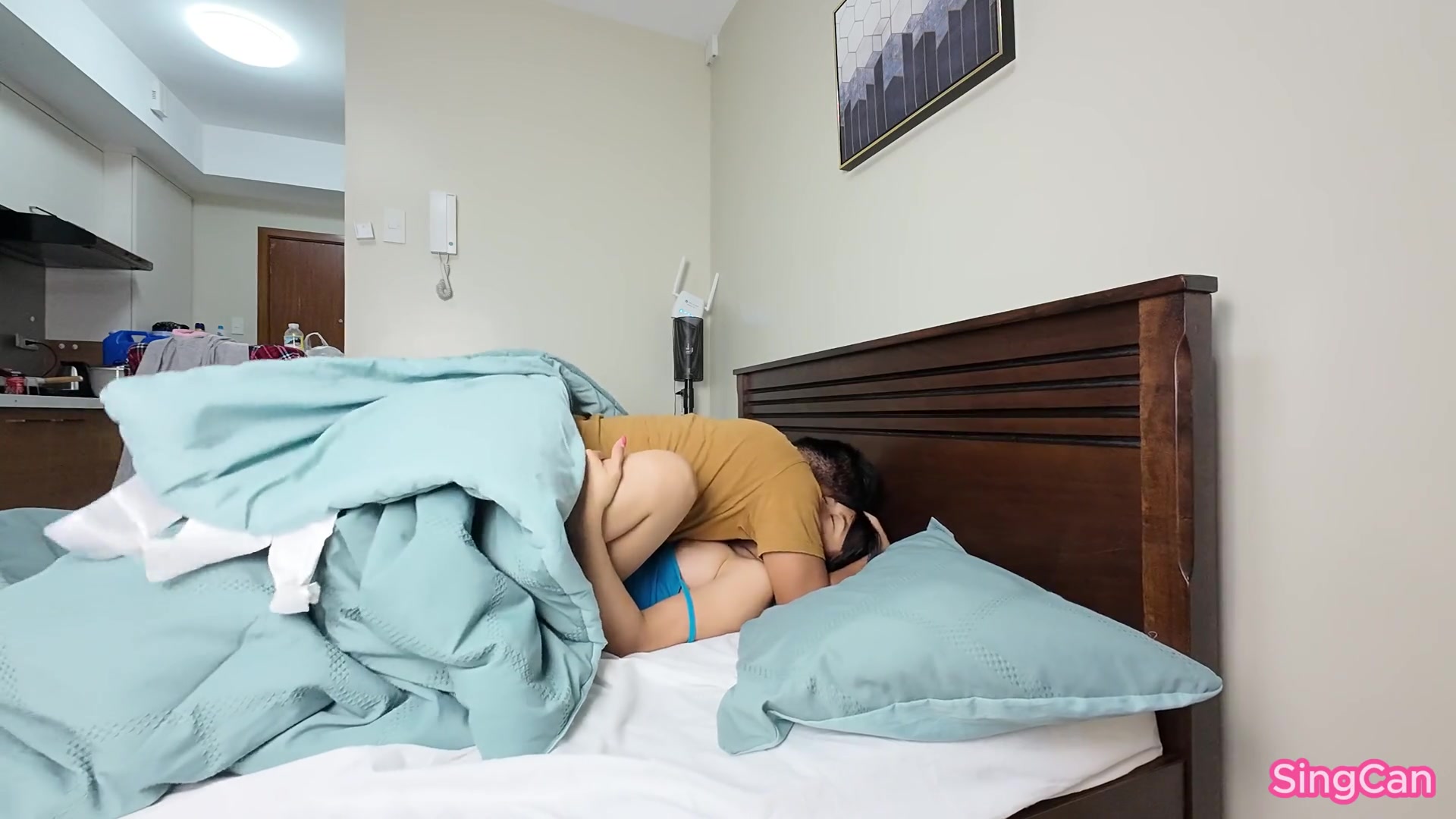Step son's friend fuck his new step mom while phone talking in share bed