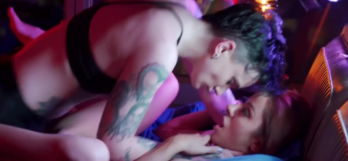 Description: Tattooed dyke strapon fucking lesbian after cunnilingus